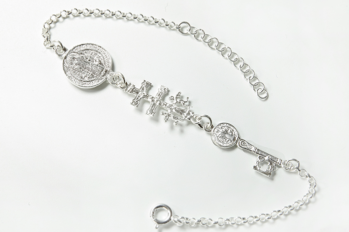PULSERA PLATA TRIPLE PROTECCION MEDALLA SAN BENITO, CRUZ DE CARAVACA Y LLAVE DE SAN JUDAS TADEO